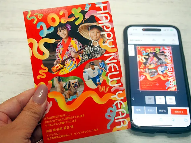年賀状に印刷したい写真を選んで挨拶文や差出人情報を変更するだけなので操作も簡単。